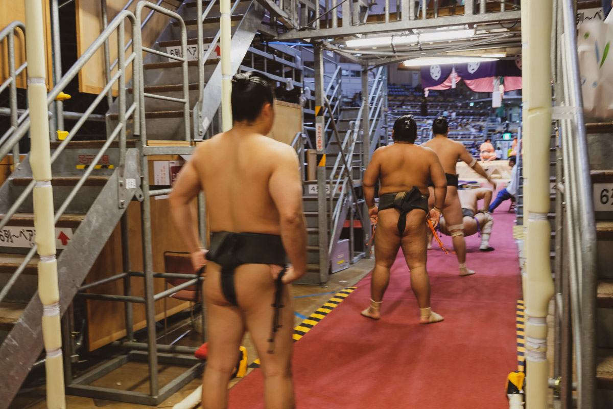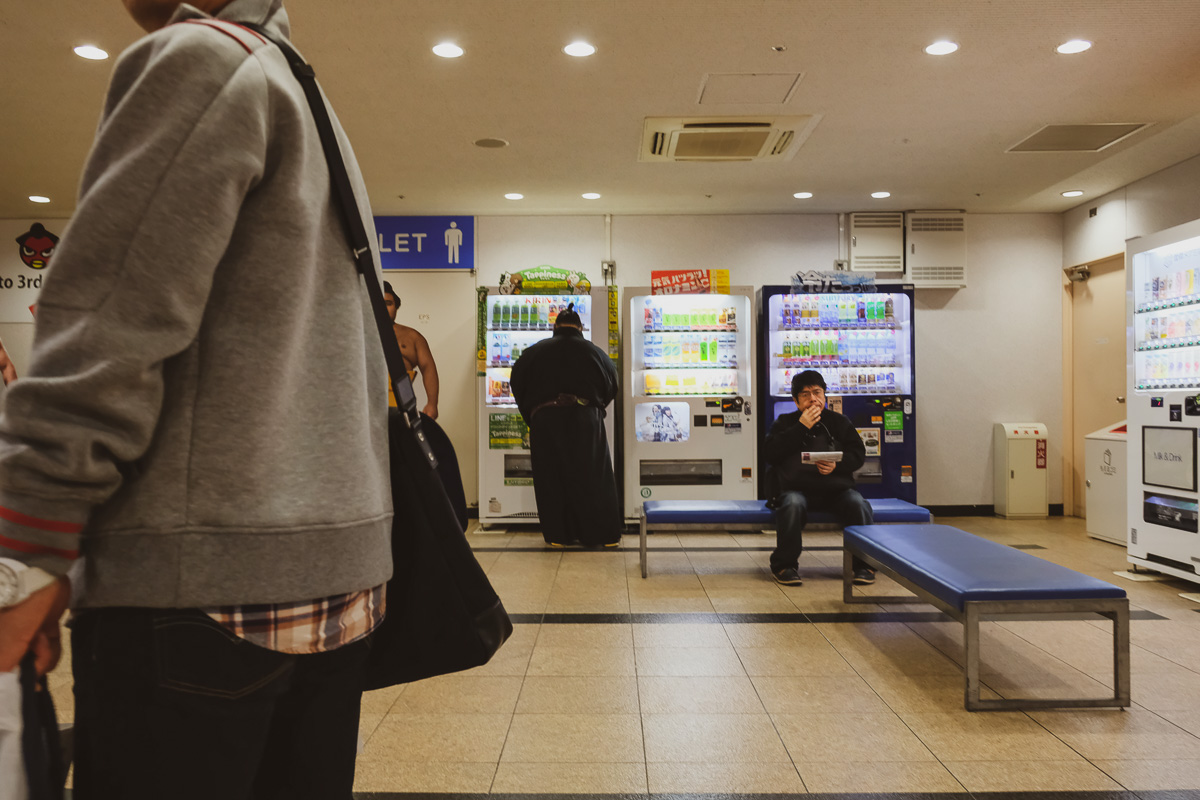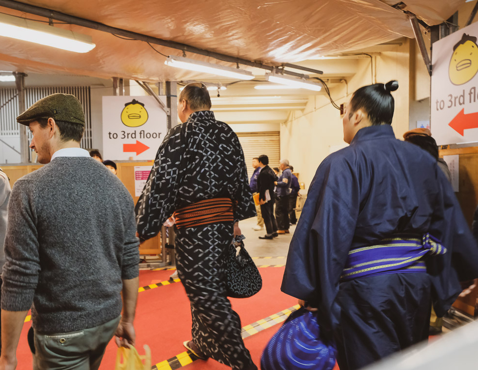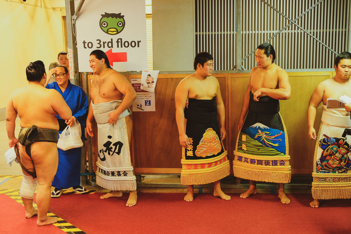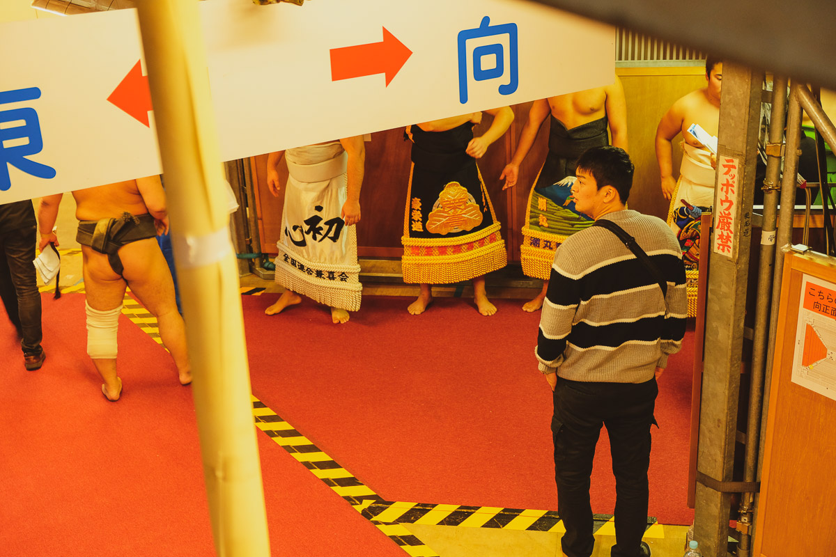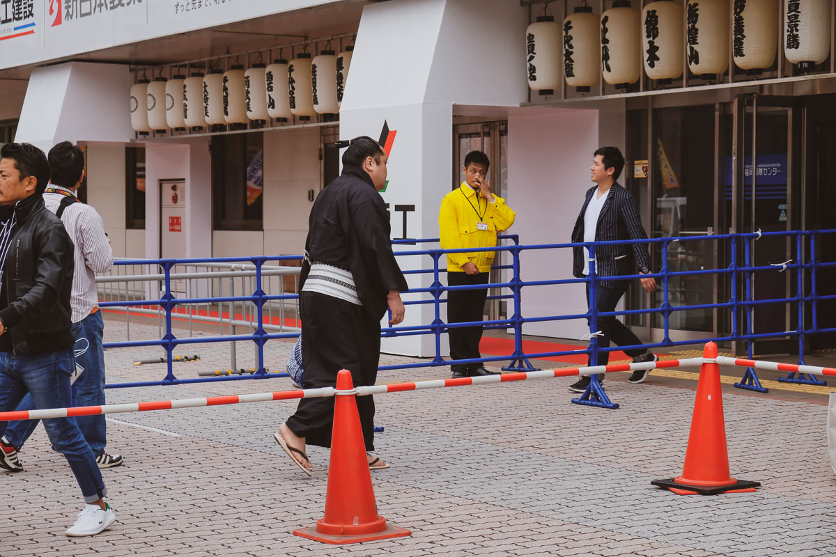 With bento box lunches in hand, we took a taxi from the station to the Kokusai Center. Here, brightly coloured banners are our landmarks, but the sumo wrestlers in black and white yukatas and their iconic hair tells us we’re here.