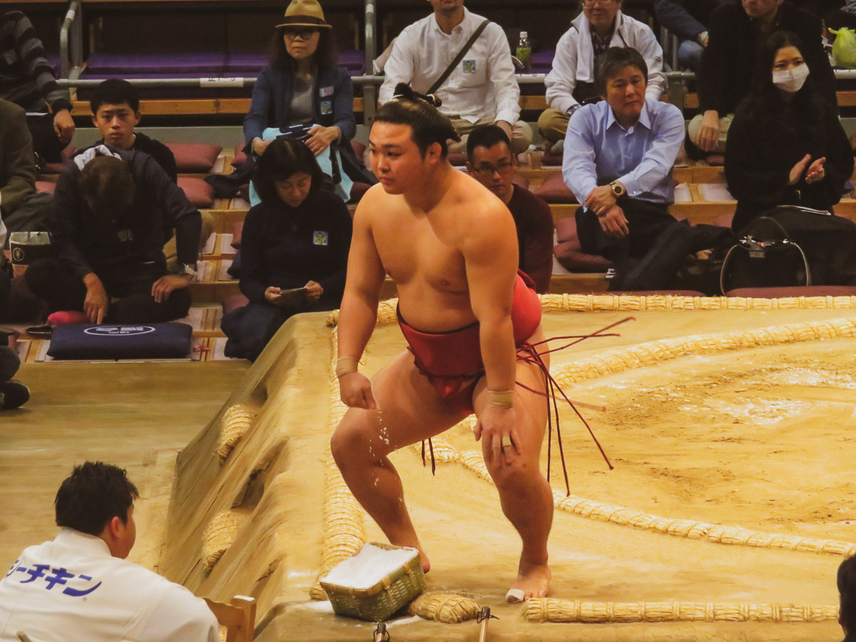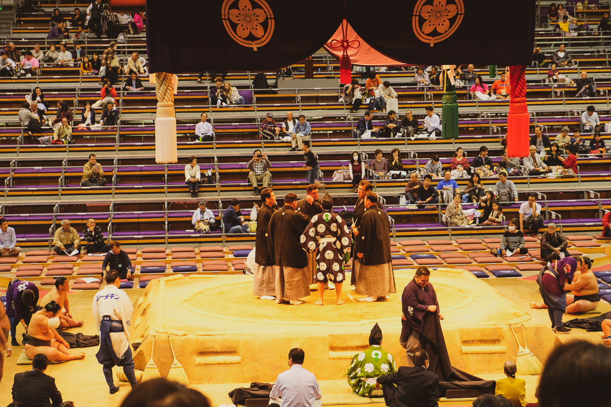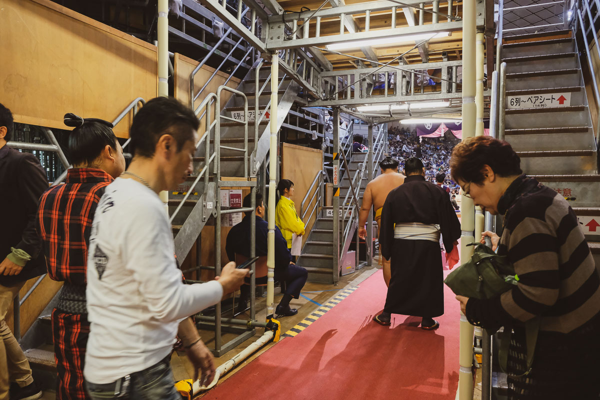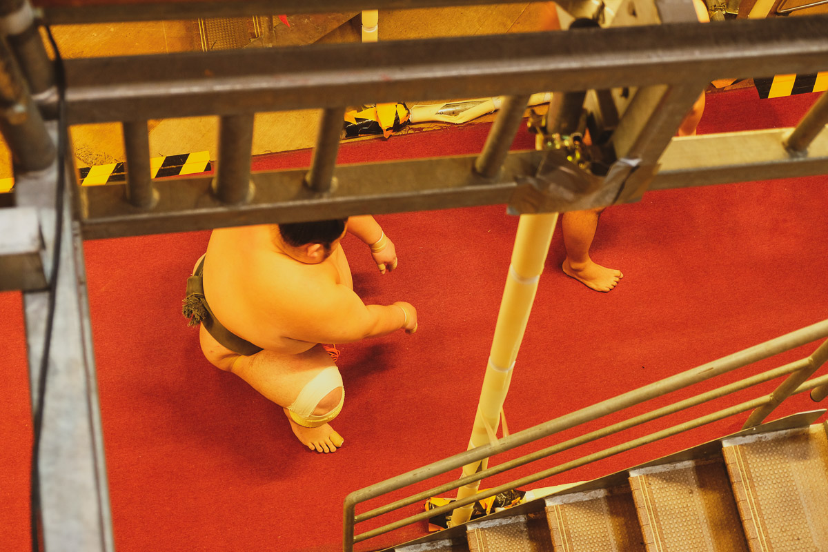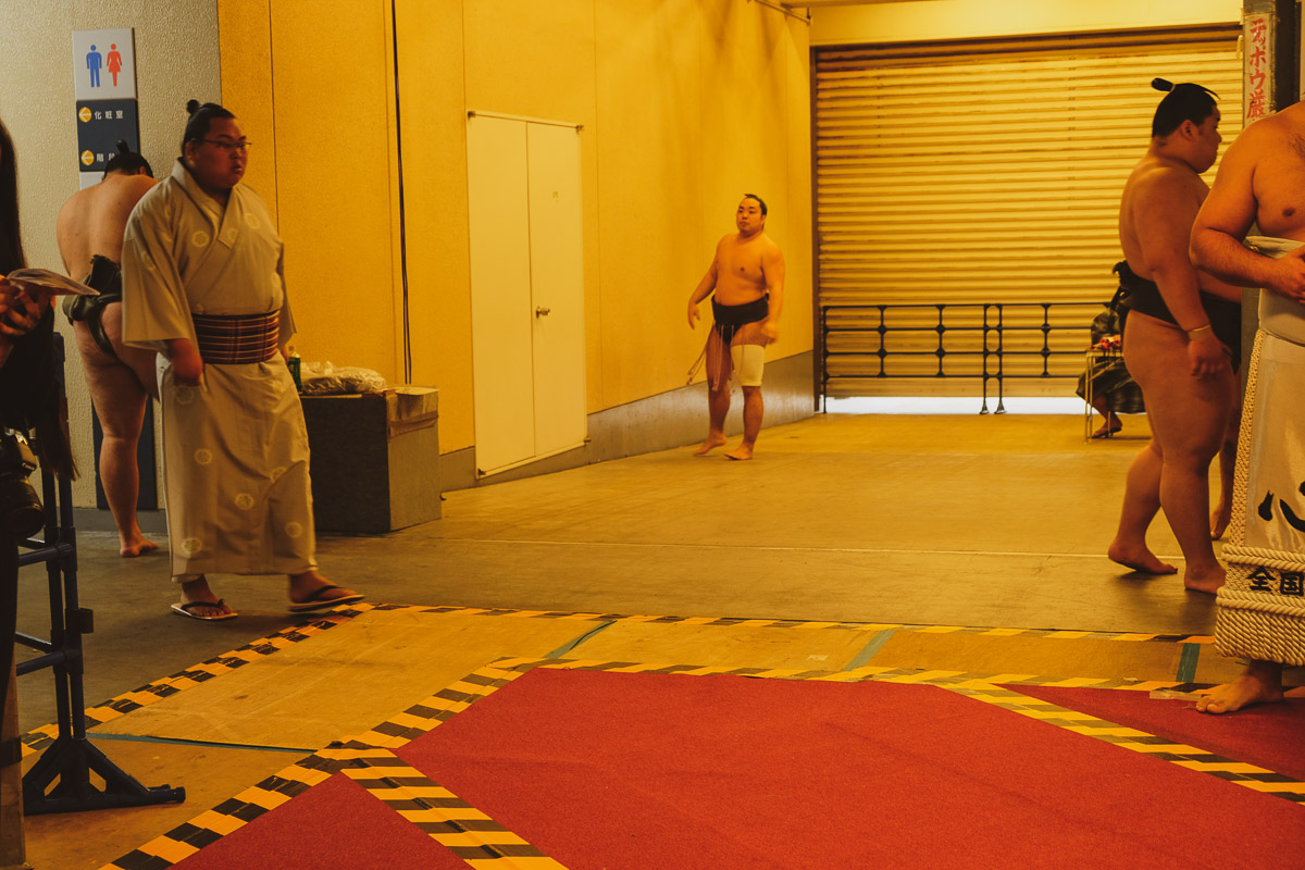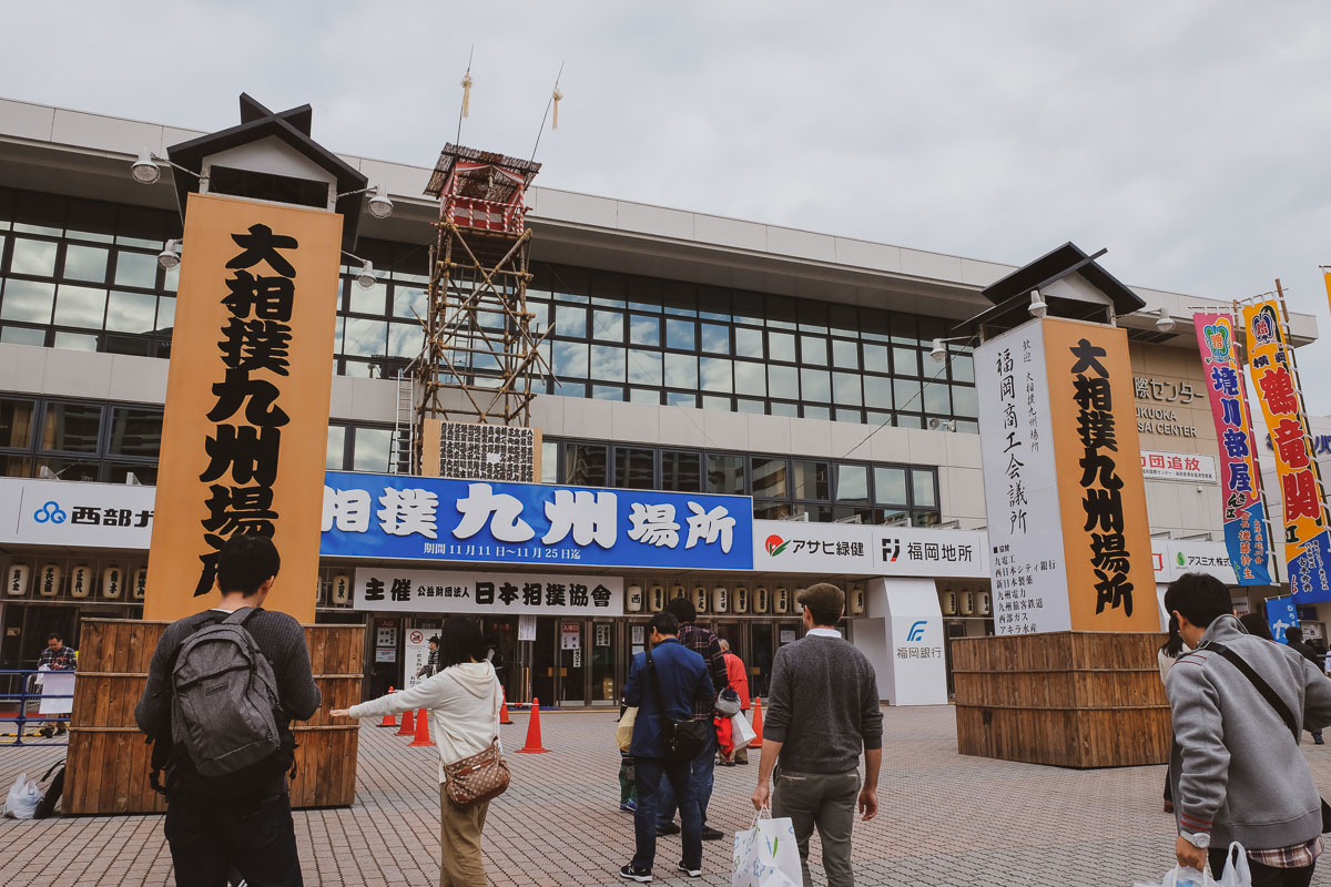 With bento box lunches in hand, we took a taxi from the station to the Kokusai Center. Here, brightly coloured banners are our landmarks, but the sumo wrestlers in black and white yukatas and their iconic hair tells us we’re here.
