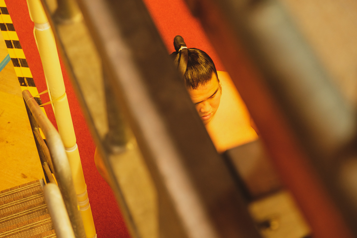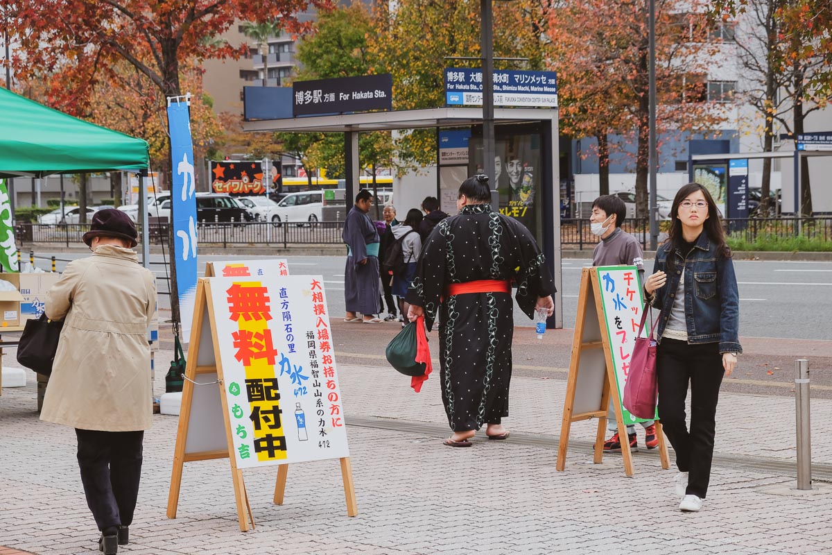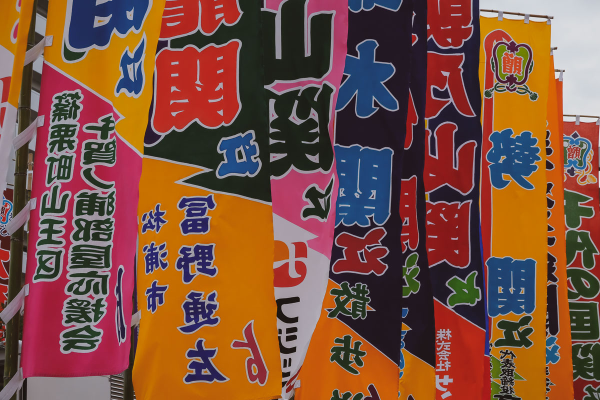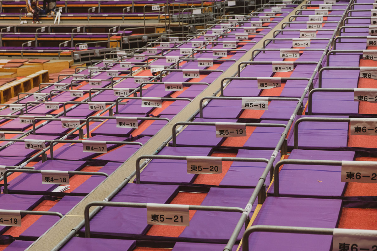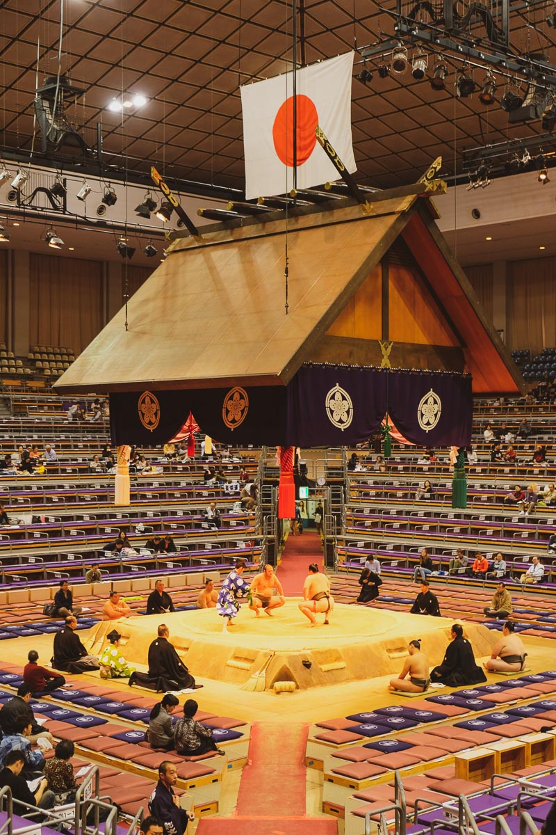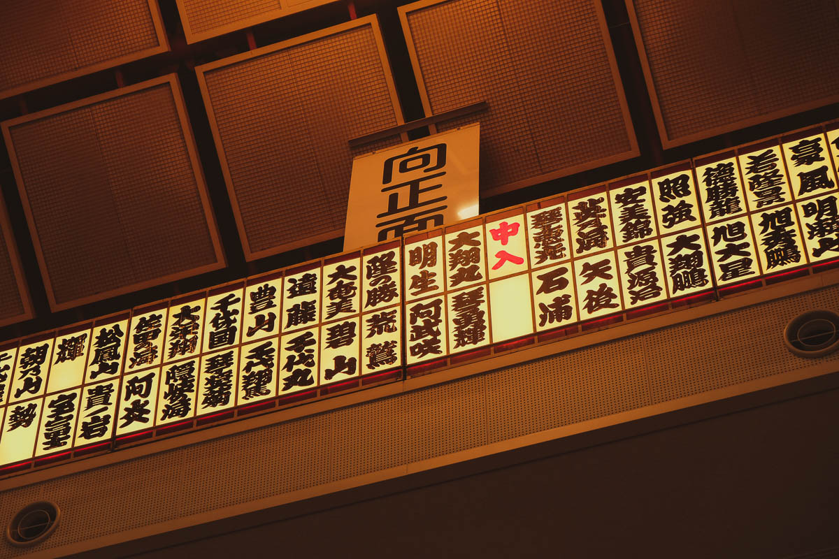 With bento box lunches in hand, we took a taxi from the station to the Kokusai Center. Here, brightly coloured banners are our landmarks, but the sumo wrestlers in black and white yukatas and their iconic hair tells us we’re here.